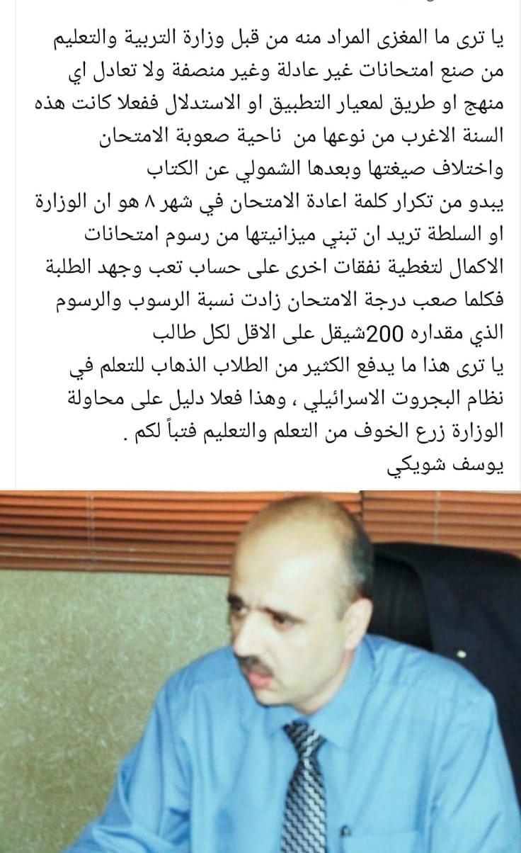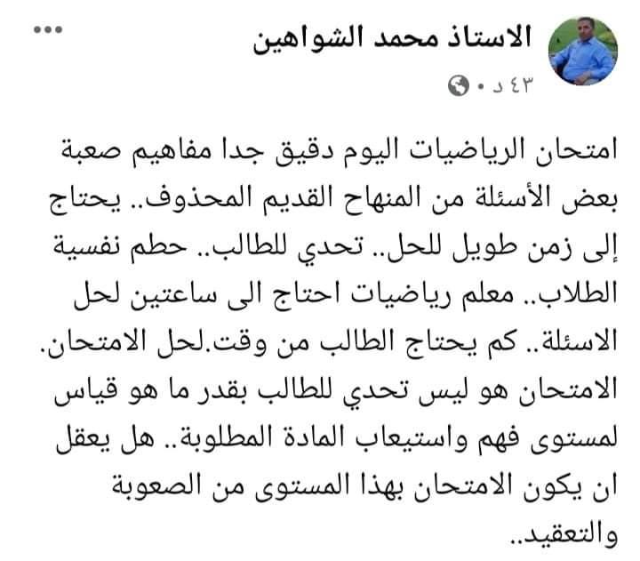 يذكر، انه منذ يوم أمس وصلنا مئات الشكاوي من قبل الأهالي والطلبة تتعلق بإمتحان الرياضيات للفرع العلمي، انه لم يراعي جميع المستويات، معظم الاسئلة كانت من خارج الكتاب، كما أنه لم يراعي الحالة النفسية التي يمر بها الطلبة منذ بداية أزمة كورونا والضغط النفسي الذي تعرضوا له خلال الفترة الماضية.