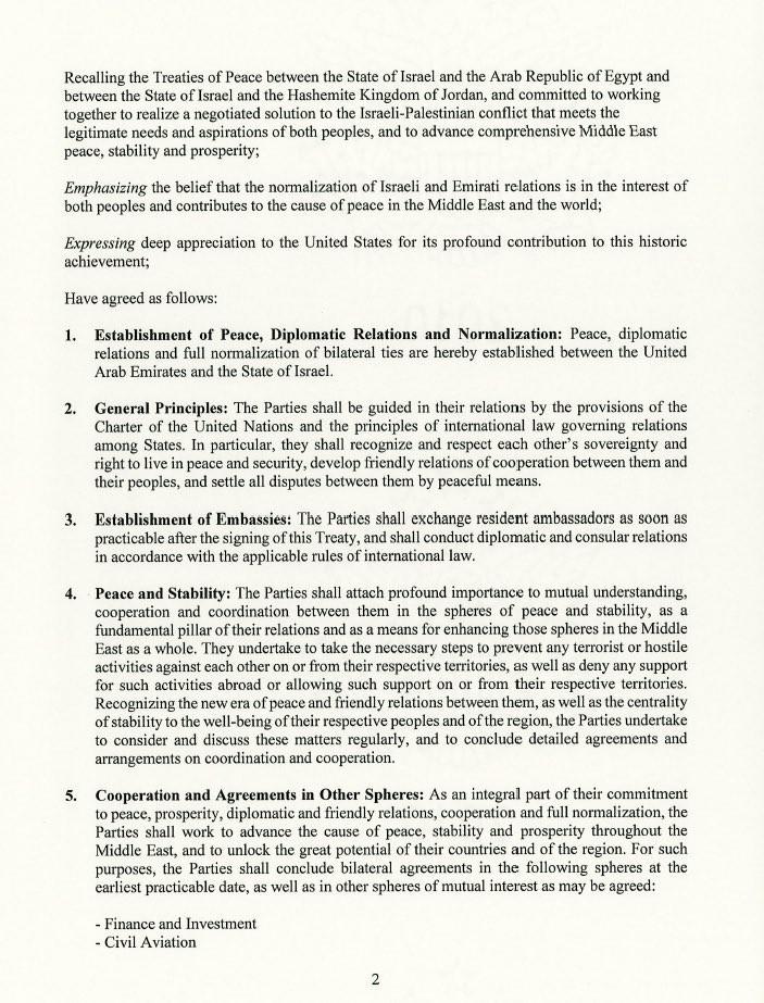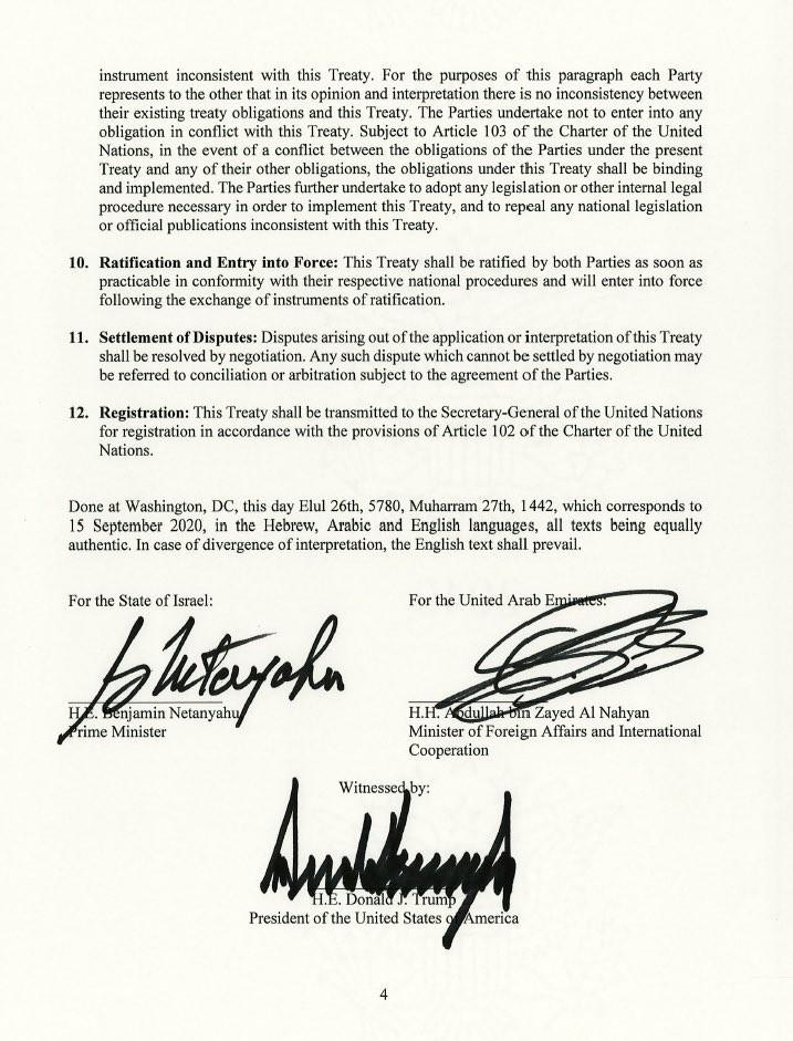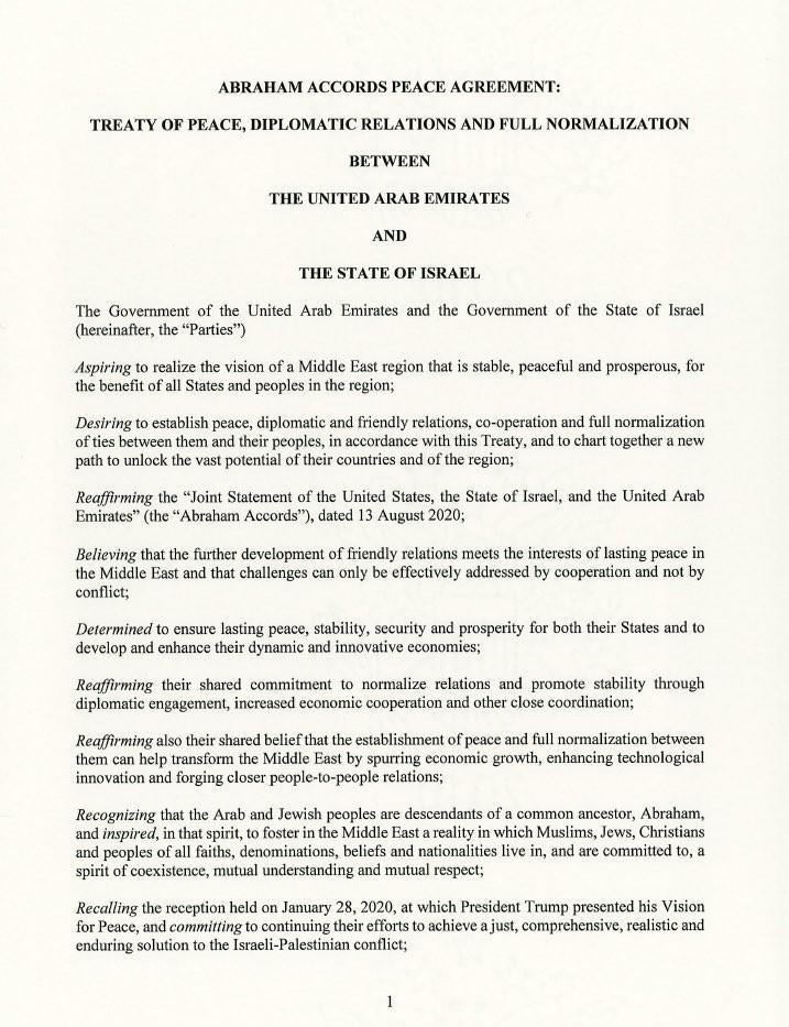 أصدر البيت الأبيض نص اتفاقية التطبيع الإماراتية- الإسرائيلية، التي تتألف من أربع صفحات، بعد ساعات من حفل التوقيع على الاتفاق الثلاثي بين الإمارات والبحرين وكيان الاحتلال الإسرائيلي في واشنطن.