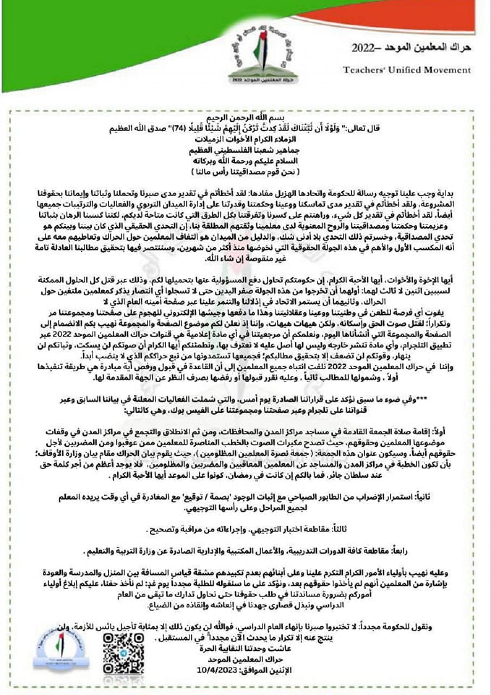 وقال الحراك في بيان صدر عنه، مساء اليوم الاثنين، "نقول للحكومة لا تختبروا صبرنا بإنهاء العام الدراسي، فهذا تأجيل يائس للأزمة، وندعو لإقامة صلاة الجمعة القادمة في مساجد مراكز المدن بعنوان "جمعة نصرة المعلمين المظلومين"، ثم ستنطلق وقفات داعمة لمطالب المعلمين، ونؤكد على استمرار الإضراب كما هو، ومقاطعة اختبار التوجيهي من مراقبة وتصحيح.