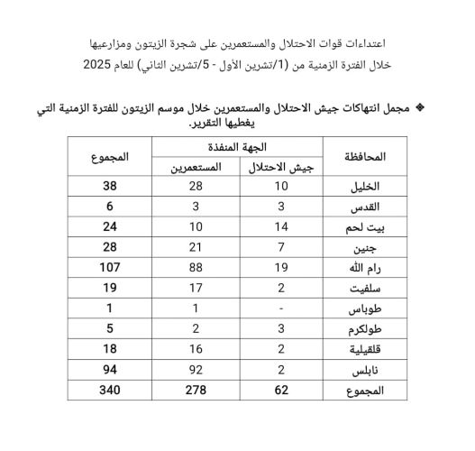 وبين شعبان، أن المعطيات الرقمية تشير إلى نسق متصاعد في الاعتداءات المسجلة من قبل طواقم التوثيق في الهيئة على مستوى المواسم الماضية يدلل على سياسة باتت ملموسة بشكل كبير في استهداف إرهابي لموسم الزيتون الفلسطيني، حيث تصاعدت الاعتداءات بدءًا من موسم 2022 بـ 136 اعتداء إلى 333 اعتداء في موسم 2023 وصولاً إلى 407 اعتداءات للعام 2024 وصولاً إلى340 اعتداء حتى اللحظة للموسم الحالي، مما يوضح وبما لا يدع مجالاً للشك حجم الاستهداف الذي يتعرض له المزارعون الفلسطينيون.