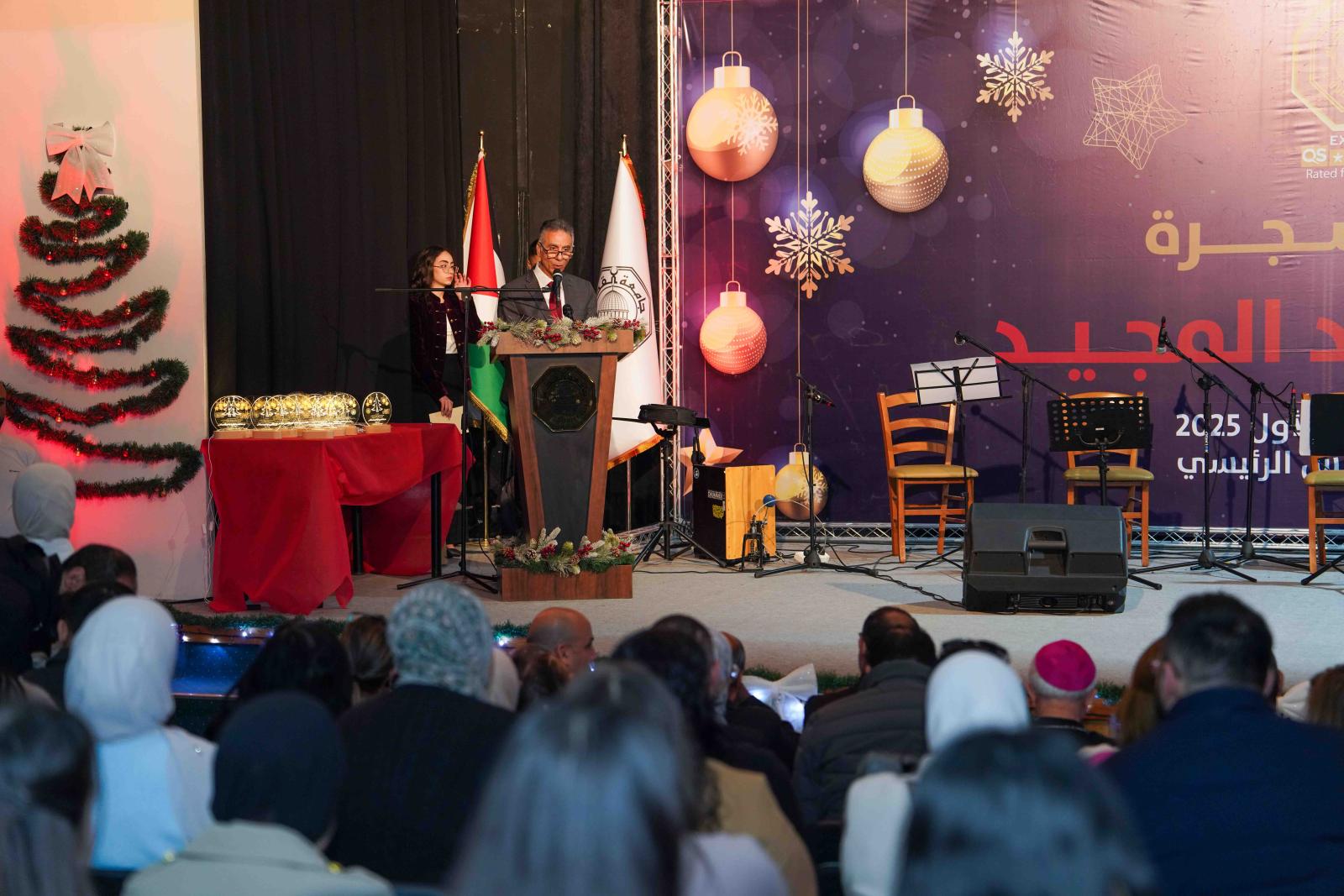 وفي كلمته، عبّر رئيس الجامعة أ.د. حنا عبد النور عن سعادته بهذا اليوم الذي وصفه بأنه يوم مبارك تسطع فيه أنوار الميلاد طريقًا للسلام والحق والحياة، مؤكدًا أن إضاءة الشجرة في جامعة القدس هي رسالة أمل تضيء القلوب وتعبر عن روح العطاء.