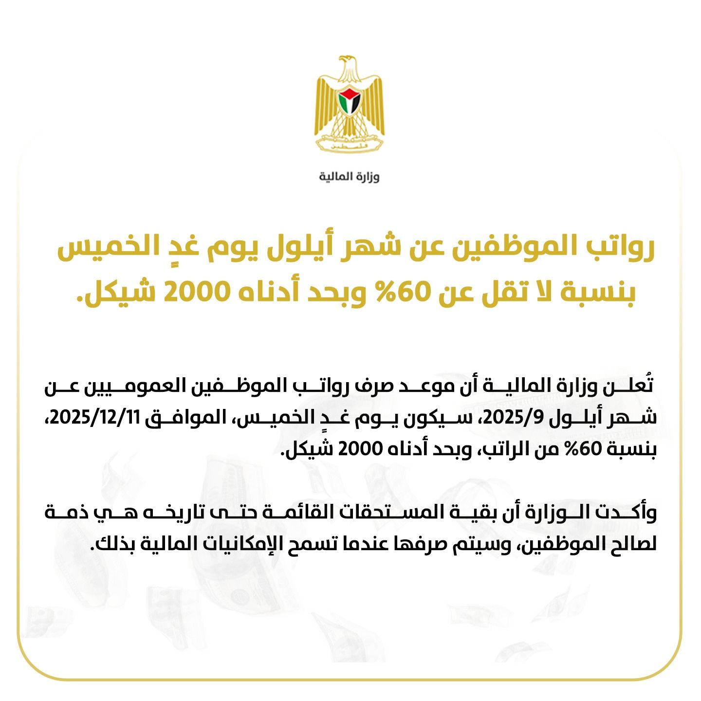 أعلنت وزارة المالية أن موعد صرف رواتب الموظفين العموميين عن شهر أيلول 9/2025، سيكون يوم غدٍ الخميس، الموافق 11/12/2025، بنسبة 60% من الراتب، وبحد أدناه 2000 شيكل.