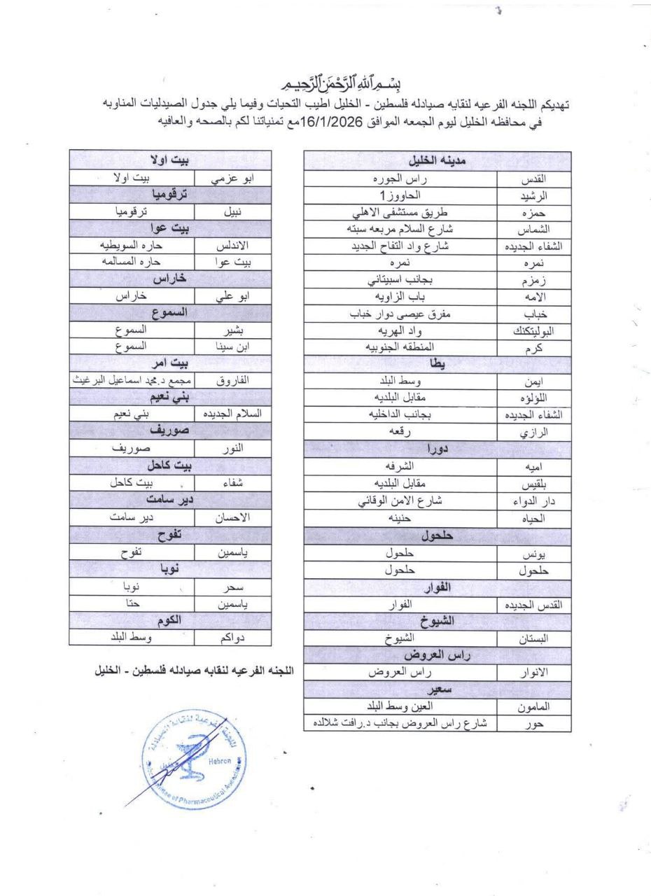 الصيدليات المناوبة اليوم الجمعة الموافق 16/1/2026 في محافظة الخليل: