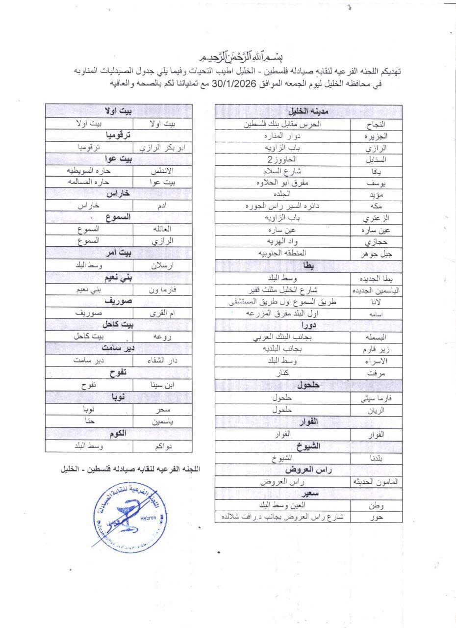 الصيدليات المناوبة في محافظة الخليل