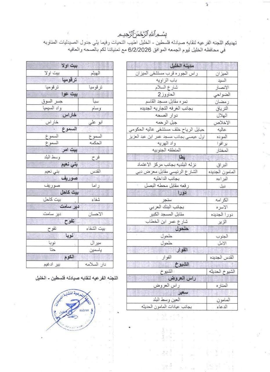 الصيدليات المناوبة في محافظة الخليل ليوم الجمعة الموافق 6/2/2026