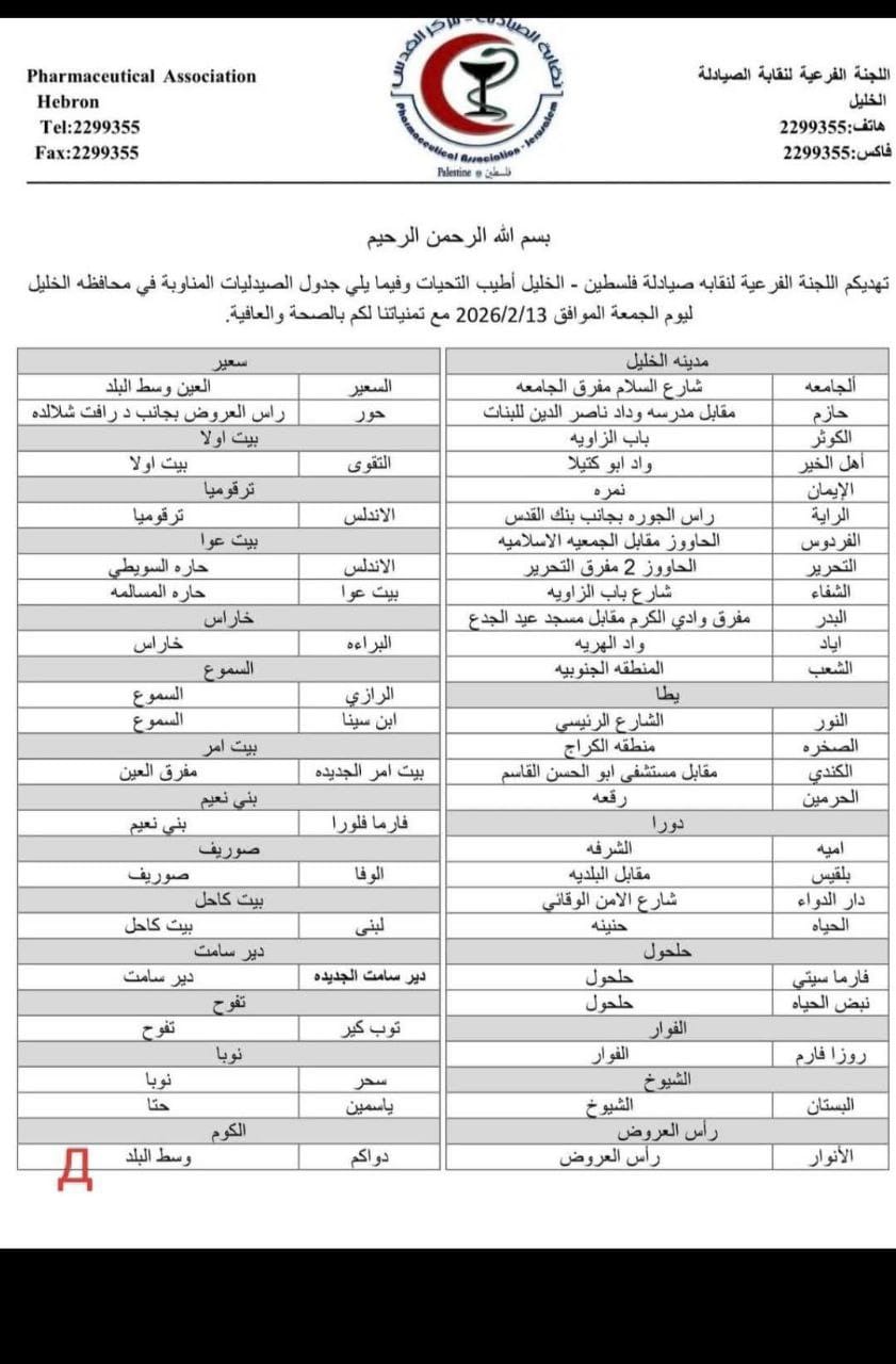 الصيدليات المناوبة في محافظة الخليل ليوم الجمعة، الموافق 2026/02/13: