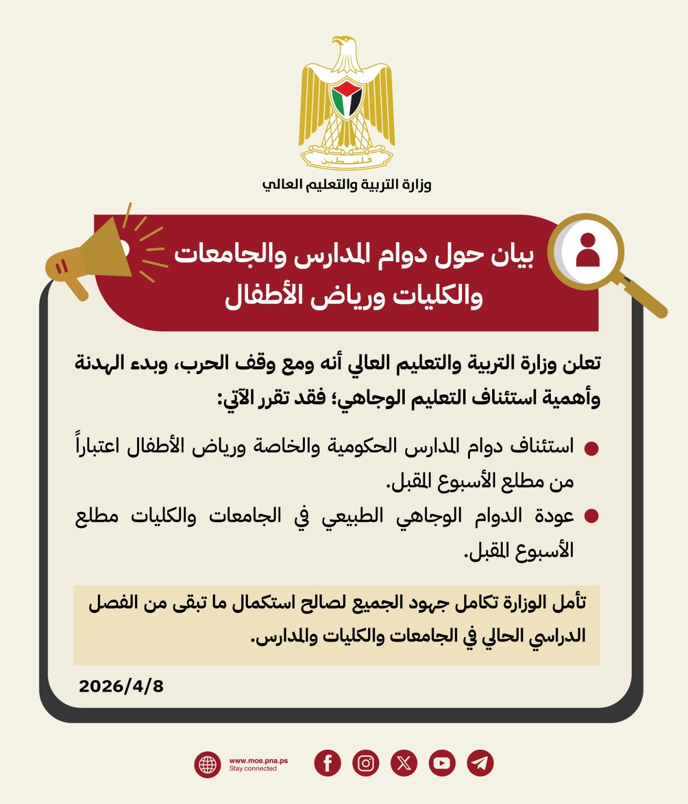 أعلنت وزارة التربية والتعليم العالي، عن استئناف دوام المدارس الحكومية والخاصة ورياض الأطفال والجامعات والكليات وجاهيا، اعتبارا من مطلع الأسبوع المقبل.