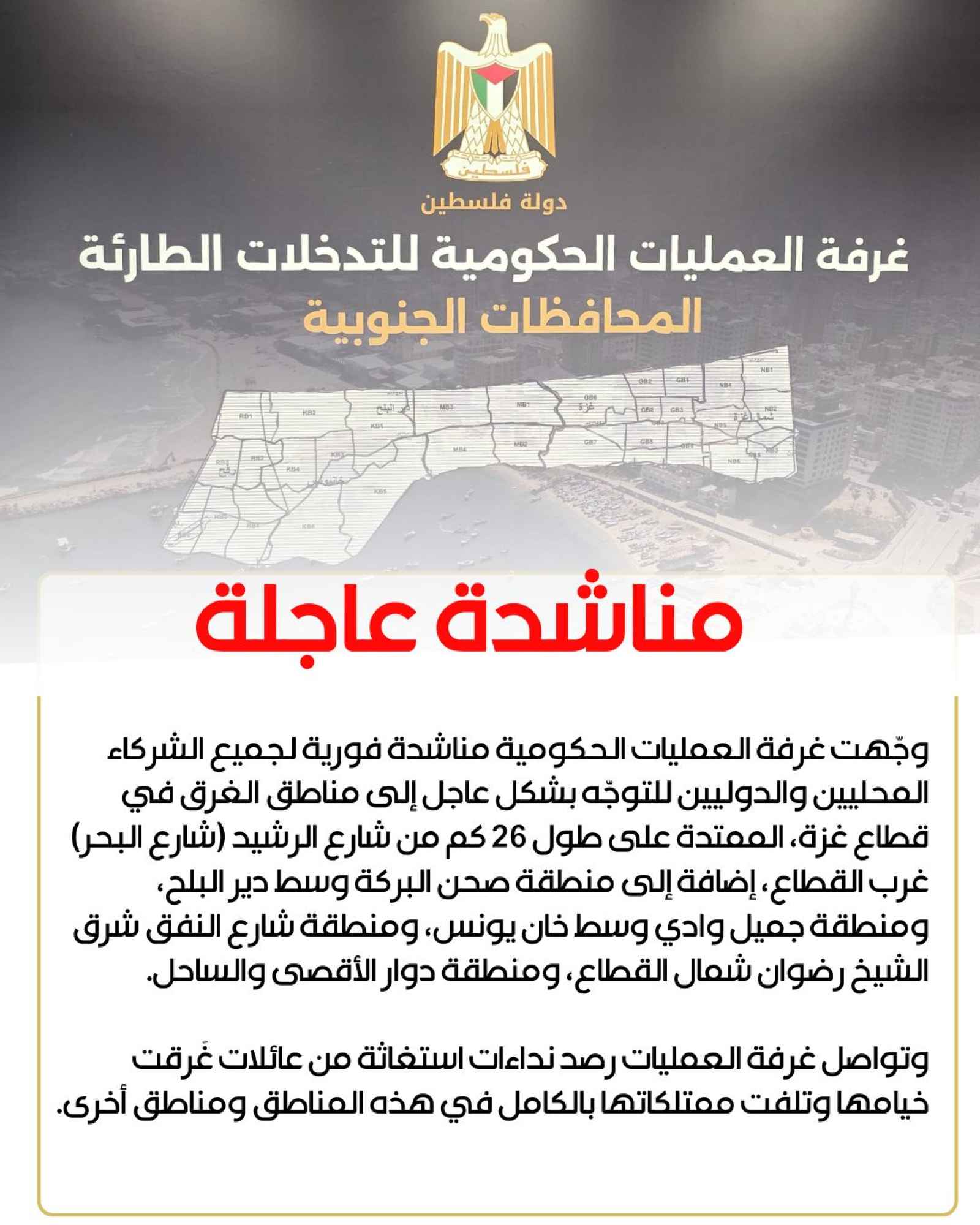 غرفة العمليات الحكومية تطلق مناشدة عاجلة للتدخل الفوري في مناطق الغرق بقطاع غزة