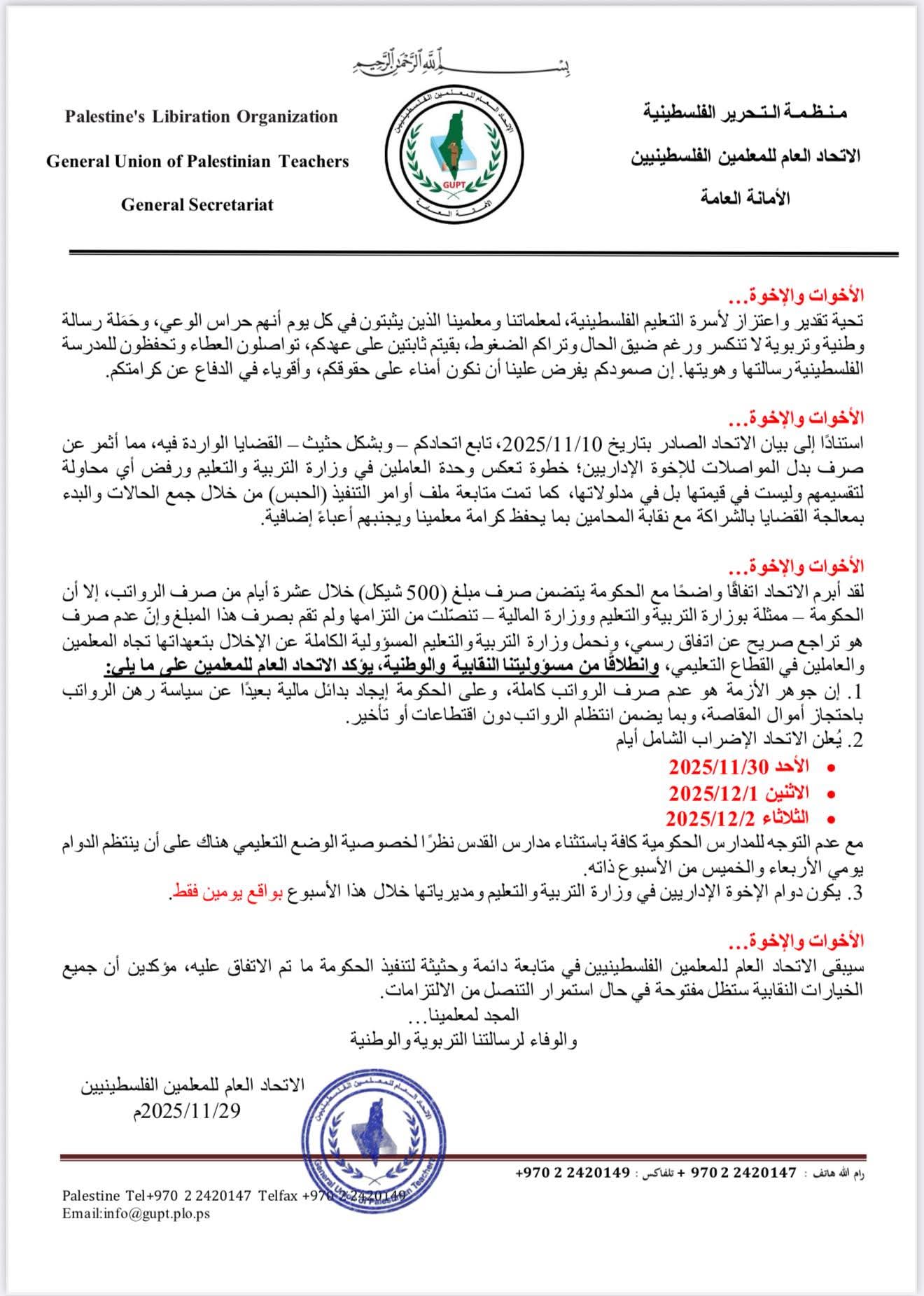 الإضراب الشامل بعد الحصة الثالثة أيام الأحد 2025/11/30 والاثنين 2025/12/1 والثلاثاء 2025/12/2.