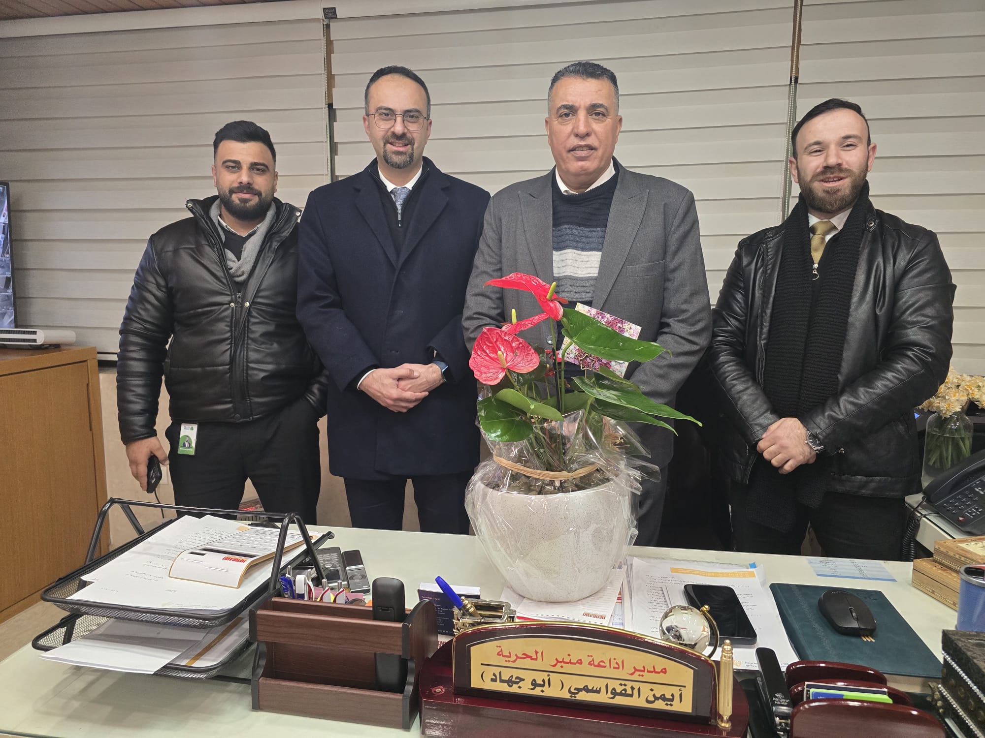 من جانبه، رحّب السيد أيمن القواسمي بالوفد الزائر، مثمنًا هذه اللفتة الأخوية، ومشيدًا بالعلاقة المميزة التي تجمع إذاعة منبر الحرية بشركة جوال، ودورها الداعم للمؤسسات الإعلامية الفلسطينية.