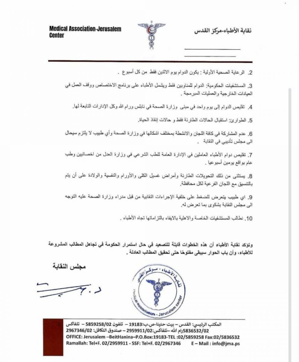 أعلنت نقابة الأطباء اليوم الاربعاء، سلسلة من الإجراءات التصعيدية، أبرزها وقف الالتزام بالبصمة لجميع الأطباء العاملين في وزارة الصحة، وتقليص دوام الرعاية الصحية الأولية ليقتصر على يوم واحد أسبوعياً (يوم الاثنين)، إضافة إلى اقتصار عمل المستشفيات الحكومية على المناوبين فقط مع وقف العيادات الخارجية والعمليات المبرمجة. كما قررت النقابة تقليص دوام الإدارات التابعة لوزارة الصحة إلى يوم واحد في الأسبوع، والاكتفاء باستقبال الحالات الطارئة وإنقاذ الحياة في أقسام الطوارئ.