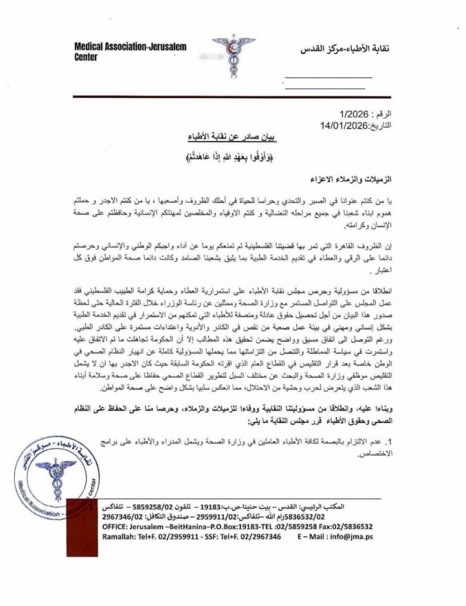 وقالت النقابة في بيان وصل وطن نسخة منه، إنها تواصلت خلال الفترة الماضية مع وزارة الصحة وممثلين عن رئاسة الوزراء، سعياً لتحصيل حقوق عادلة ومنصفة للأطباء، بما يضمن استمرارهم في تقديم الخدمة الصحية بشكل مهني رغم الظروف الصعبة التي يعيشها القطاع الصحي من نقص في الأدوية واعتداءات متكررة على الكوادر الطبية.