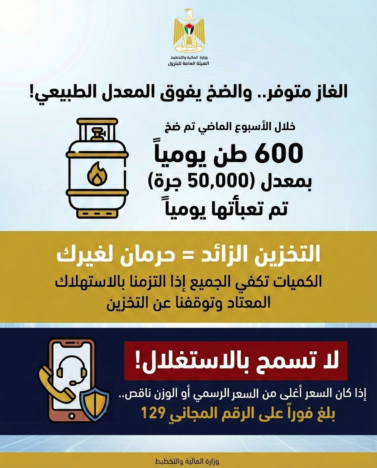 وأوضحت الوزارة أنه خلال الأسبوع الماضي تم ضخ نحو 600 طن من الغاز يوميًا، أي ما يعادل تعبئة 50 ألف جرة غاز يوميًا، وهي كميات كافية لتلبية احتياجات المواطنين في حال الالتزام بالاستهلاك المعتاد.
