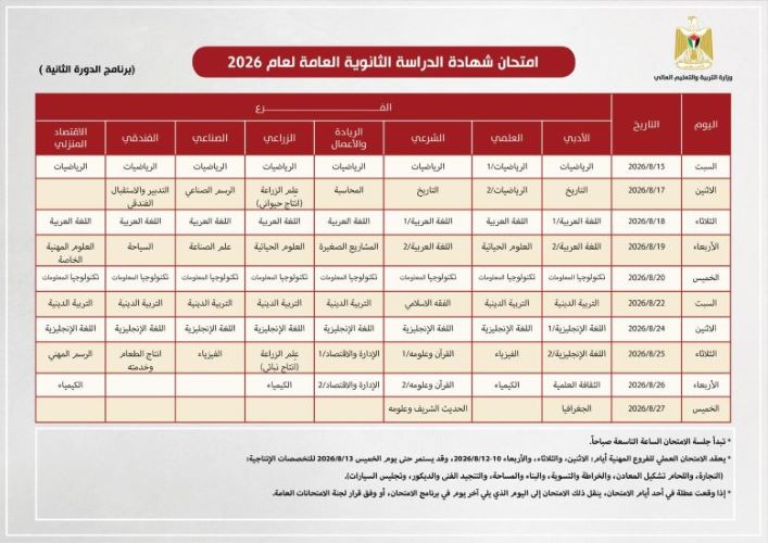 وأشارت إلى أن الامتحان العملي للفروع المهنية في الدورة الأولى يُعقد أيام 18-20/5/2026، وقد يستمر حتى يوم الخميس 21 /5/2026 للتخصصات الإنتاجية، فيما يعقد في الدورة الثانية أيام 10-12/8/2026، وقد يستمر حتى يوم الخميس 13/8/2026.
