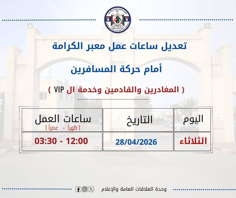قالت الهيئة العامة للمعابر والحدود، إنه سيطرأ تعديل على ساعات عمل معبر الكرامة، يوم الثلاثاء المقبل 28 نيسان/ابريل.